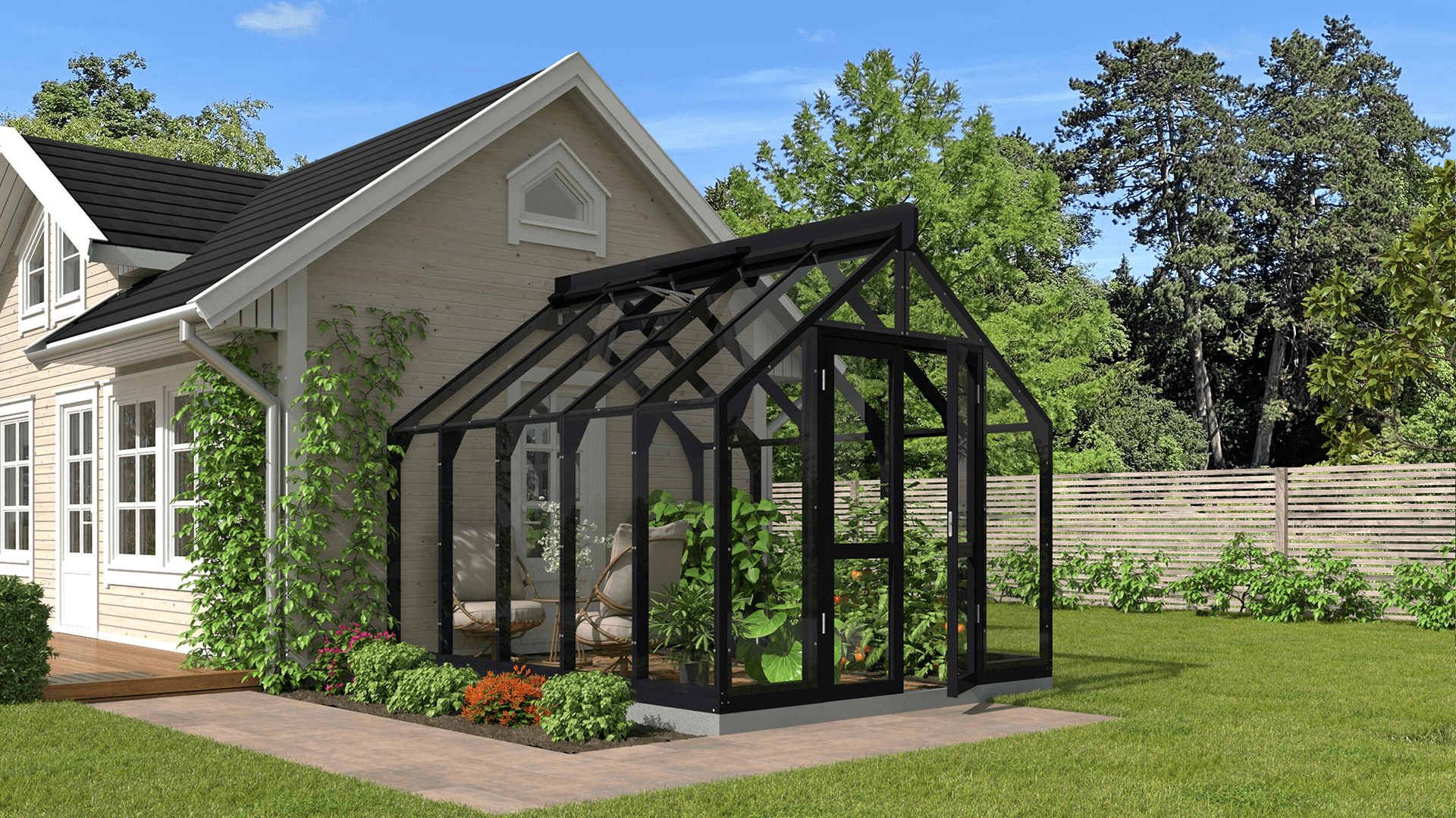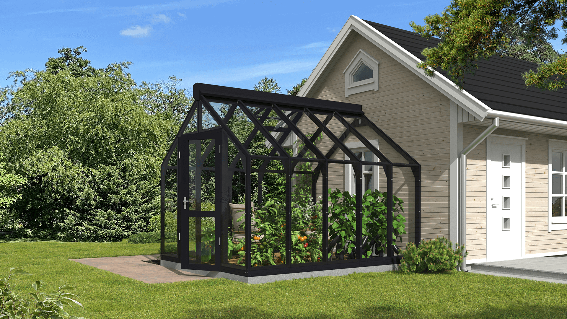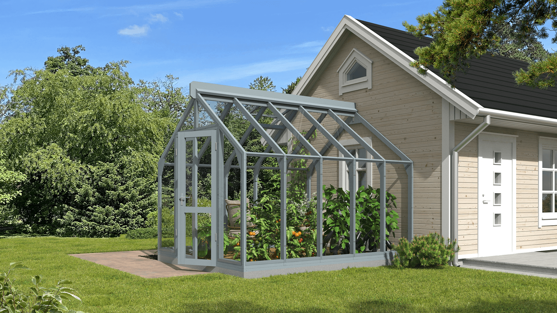 Siltumnīcai ir platas, bez sliekšņa 140 cm divvērtņu durvis ar pilnībā regulējamām 3D eņģēm.