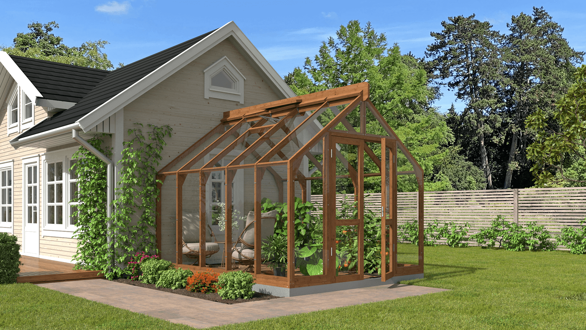 Koka sienas siltumnīca nav paredzēta tikai augu audzēšanai — tā ir skaists dārza paviljons, kur varat atpūsties, ieturēt maltītes vai uzņemt viesus zaļuma ieskauti. Koksnes dabīgais siltums rada mājīgu un aicinošu atmosfēru, pārvēršot siltumnīcu par elegantu ārtelpu. Izmantojiet to kā mierpilnu atpūtas vietu, vasaras ēdamzonu vai radošu darba telpu — tā pielāgojas katrai sezonai un situācijai. Apvienojot funkcionalitāti un šarmu, tā ir vieta, kur satiekas daba un komforts.