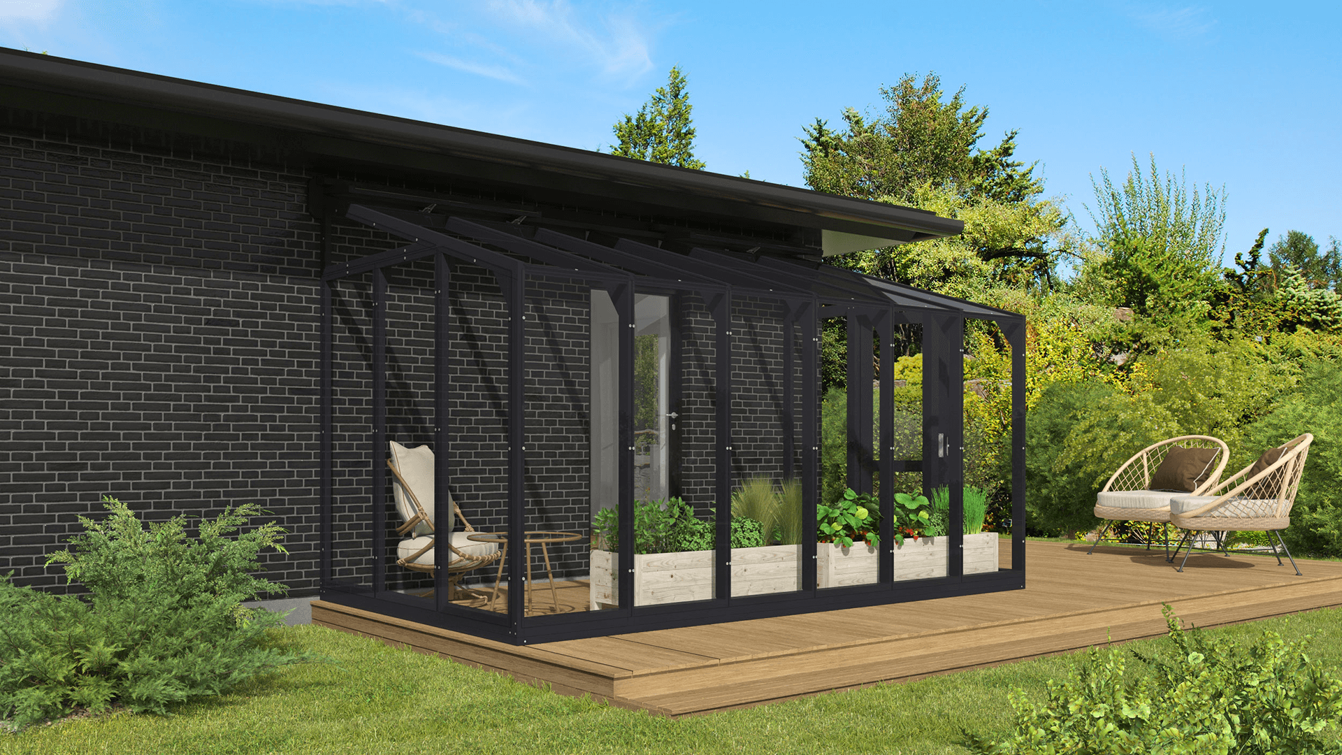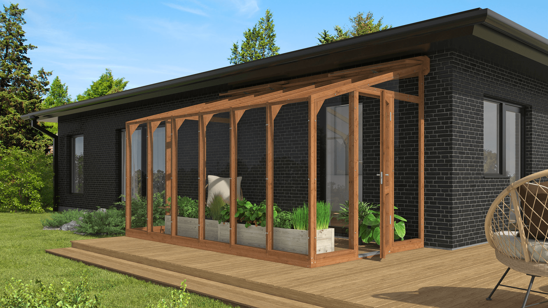 Šī koka sienas siltumnīca ir ideāls mūsdienīga dizaina un dabiskas elegances apvienojums, kas lieliski papildinās jebkuru ārtelpu. Ar savu unikālo stikla uz rāmja konstrukciju tā iemieso perfektu stila, funkcionalitātes un mūsdienu inženierijas saskaņu. Izmantojiet to svaigu, bioloģisku dārzeņu, aromātisku garšaugu un krāšņu ziedu audzēšanai vai pārvērtiet to par mājīgu atpūtas vietu, kur atjaunot saikni ar dabu un baudīt ārtelpu komfortu neatkarīgi no laikapstākļiem.