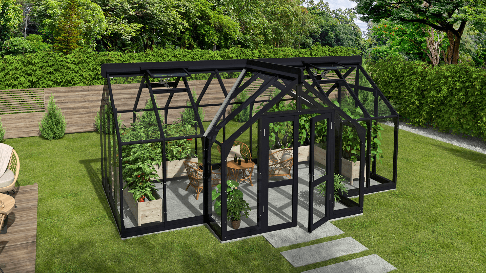 Siltumnīcai ir platas, bez sliekšņa 140 cm divvērtņu durvis ar pilnībā regulējamām 3D eņģēm.