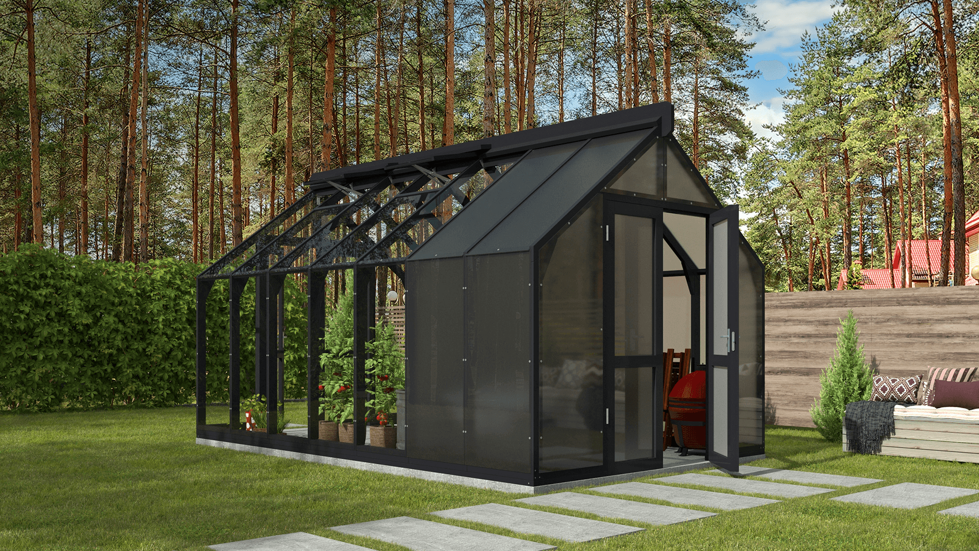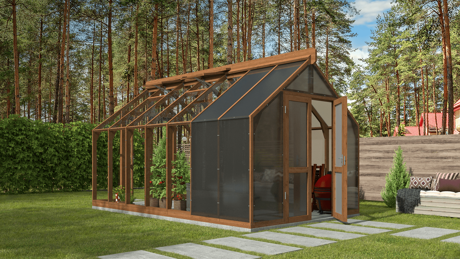 Siltumnīcas karkass ir izgatavots no izturīgas Thermowood® koksnes.