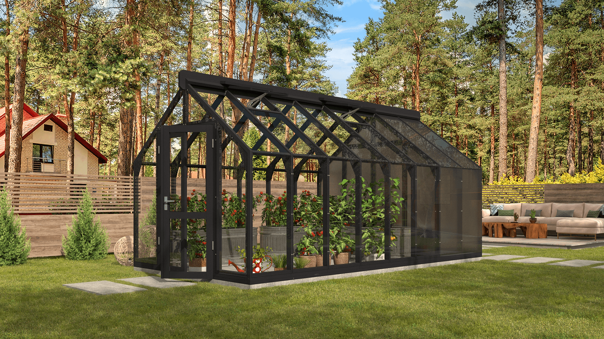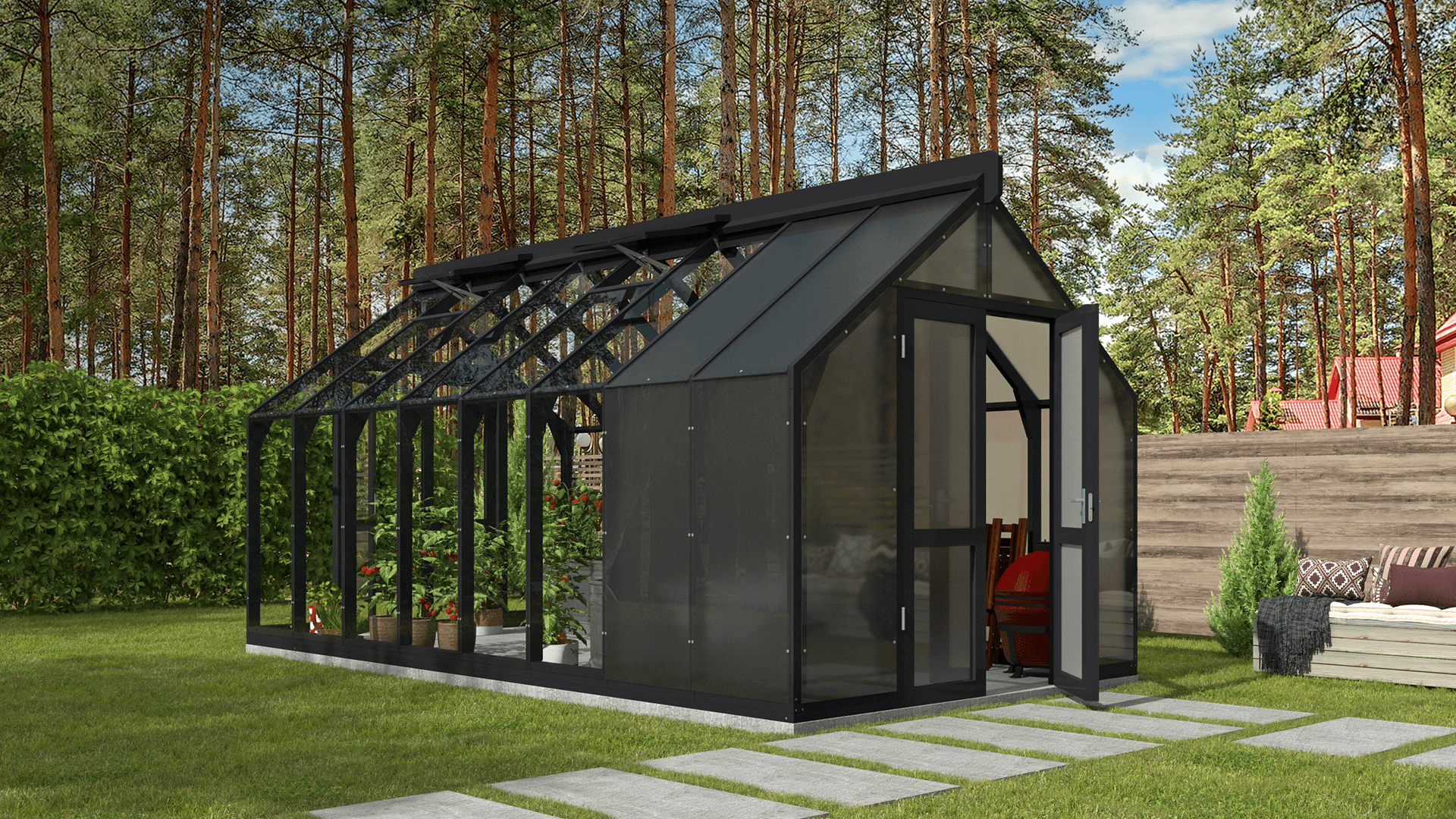 Siltumnīcas karkass ir izgatavots no izturīgas Thermowood® koksnes.