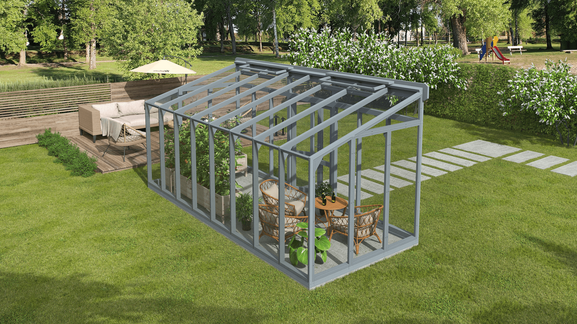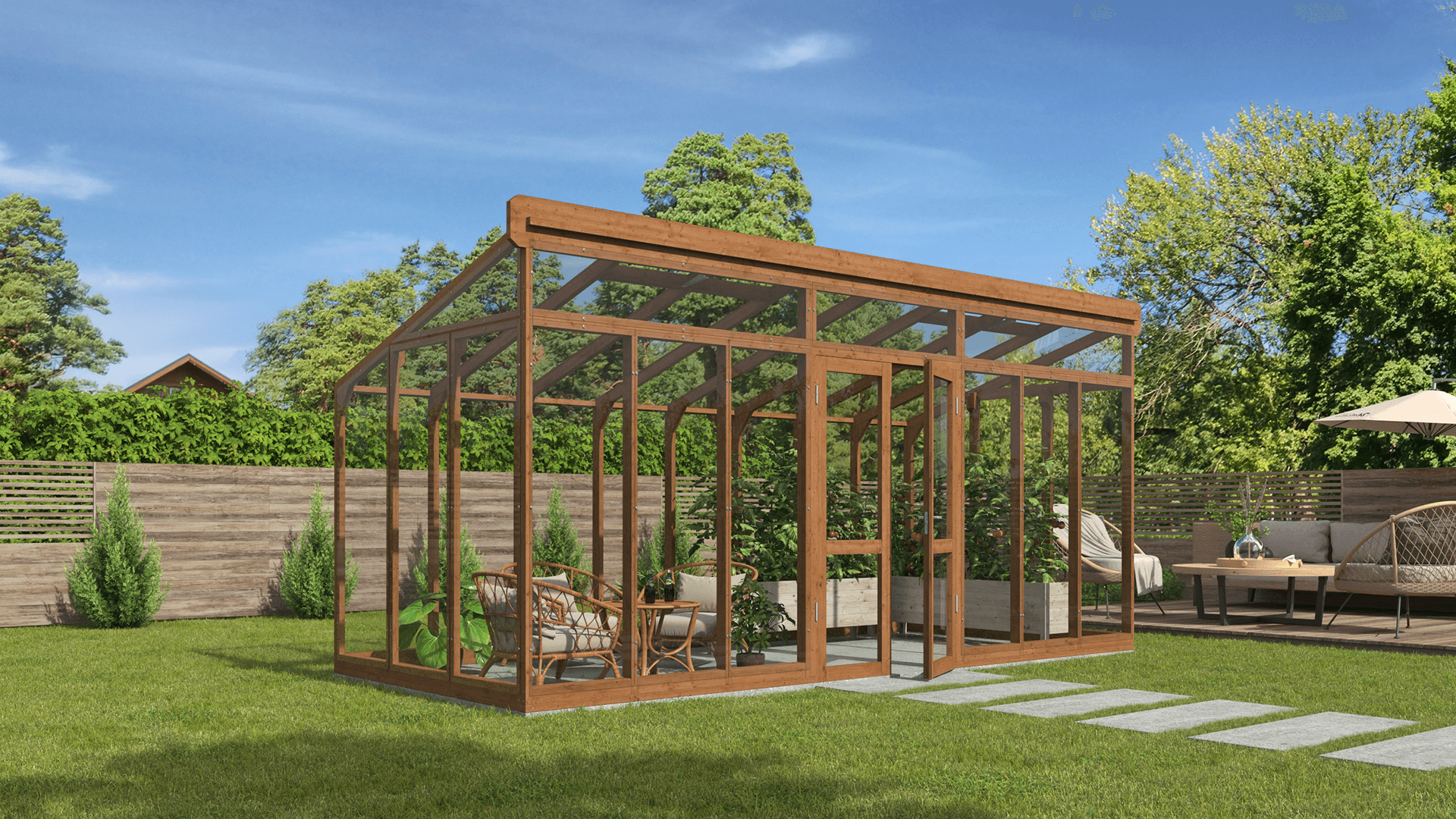 Koka siltumnīca nav paredzēta tikai augu audzēšanai — tā ir skaists dārza paviljons, kur varat atpūsties, ieturēt maltītes vai uzņemt viesus zaļuma ieskauti. Koksnes dabīgais siltums rada mājīgu un aicinošu atmosfēru, pārvēršot siltumnīcu par elegantu ārtelpu. Izmantojiet to kā mierpilnu atpūtas vietu, vasaras ēdamzonu vai radošu darba telpu — tā pielāgojas katrai sezonai un situācijai. Apvienojot funkcionalitāti un šarmu, tā ir vieta, kur satiekas daba un komforts.