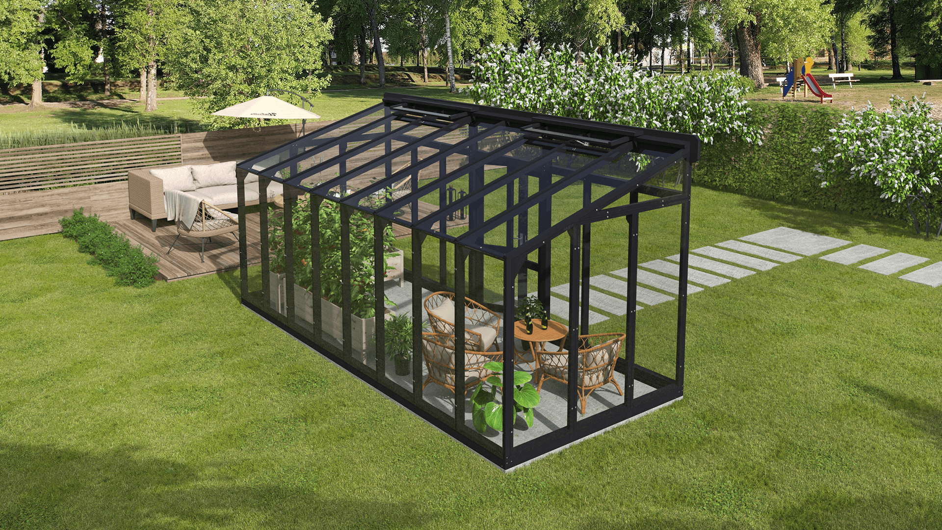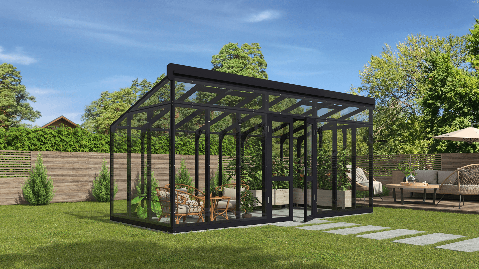 Viena no šīs moderna koka siltumnīcas raksturīgākajām īpašībām ir tās spēja harmoniski iekļauties apkārtējā vidē. Koka karkasa dabīgais siltums un tekstūra saskan ar dārza organiskajiem elementiem, radot vienotu un estētiski pievilcīgu ārtelpu. Tās daudzpusība ļauj tai pielāgoties dažādiem dārza dizainiem — no tradicionāliem lauku dārziem līdz mūsdienīgām ainavām.