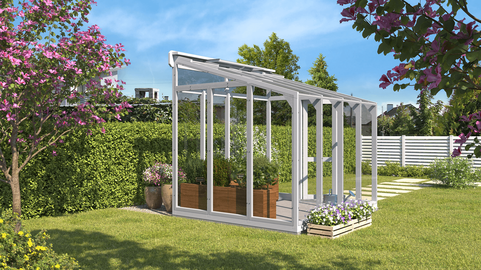 Siltumnīca ir aprīkota ar pilnībā regulējamām 3D eņģēm, durvju slēdzeni un Bayliss automātisko logu atvērēju.
