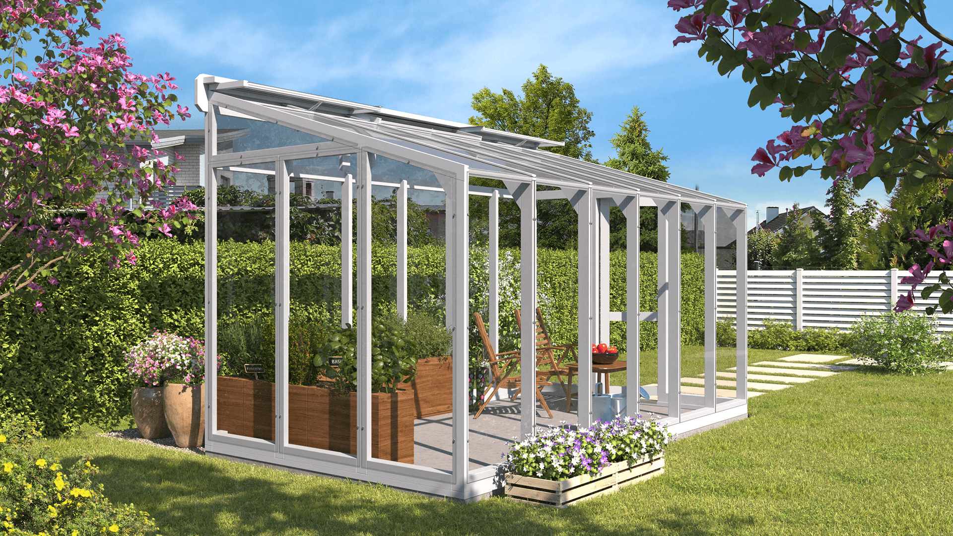 Viena no šīs moderna koka siltumnīcas raksturīgākajām īpašībām ir tās spēja harmoniski iekļauties apkārtējā vidē. Koka karkasa dabīgais siltums un tekstūra saskan ar dārza organiskajiem elementiem, radot vienotu un estētiski pievilcīgu ārtelpu. Tās daudzpusība ļauj tai pielāgoties dažādiem dārza dizainiem — no tradicionāliem lauku dārziem līdz mūsdienīgām ainavām.