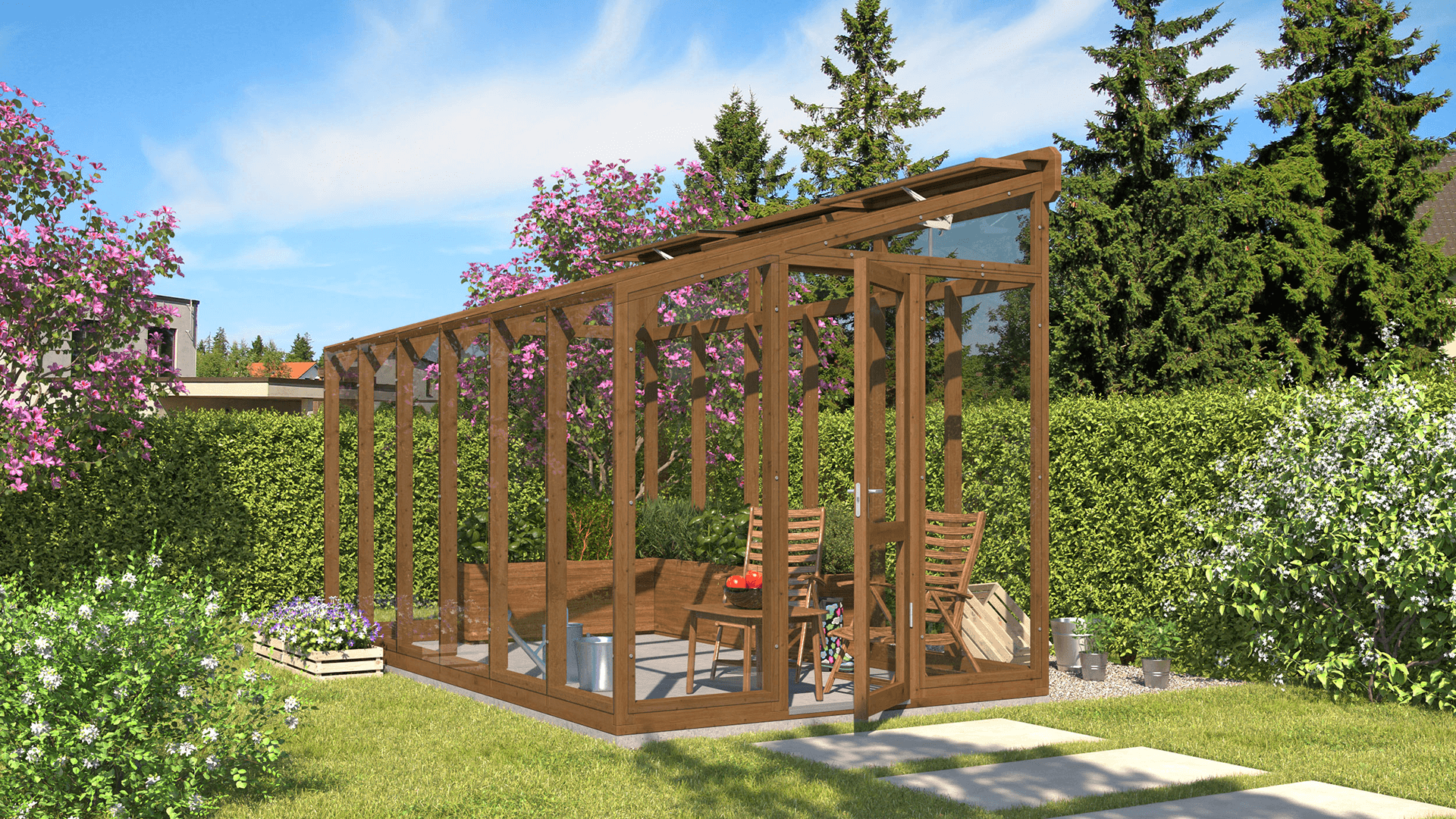 Koka siltumnīca nav paredzēta tikai augu audzēšanai — tā ir skaists dārza paviljons, kur varat atpūsties, ieturēt maltītes vai uzņemt viesus zaļuma ieskauti. Koksnes dabīgais siltums rada mājīgu un aicinošu atmosfēru, pārvēršot siltumnīcu par elegantu ārtelpu. Izmantojiet to kā mierpilnu atpūtas vietu, vasaras ēdamzonu vai radošu darba telpu — tā pielāgojas katrai sezonai un situācijai. Apvienojot funkcionalitāti un šarmu, tā ir vieta, kur satiekas daba un komforts.