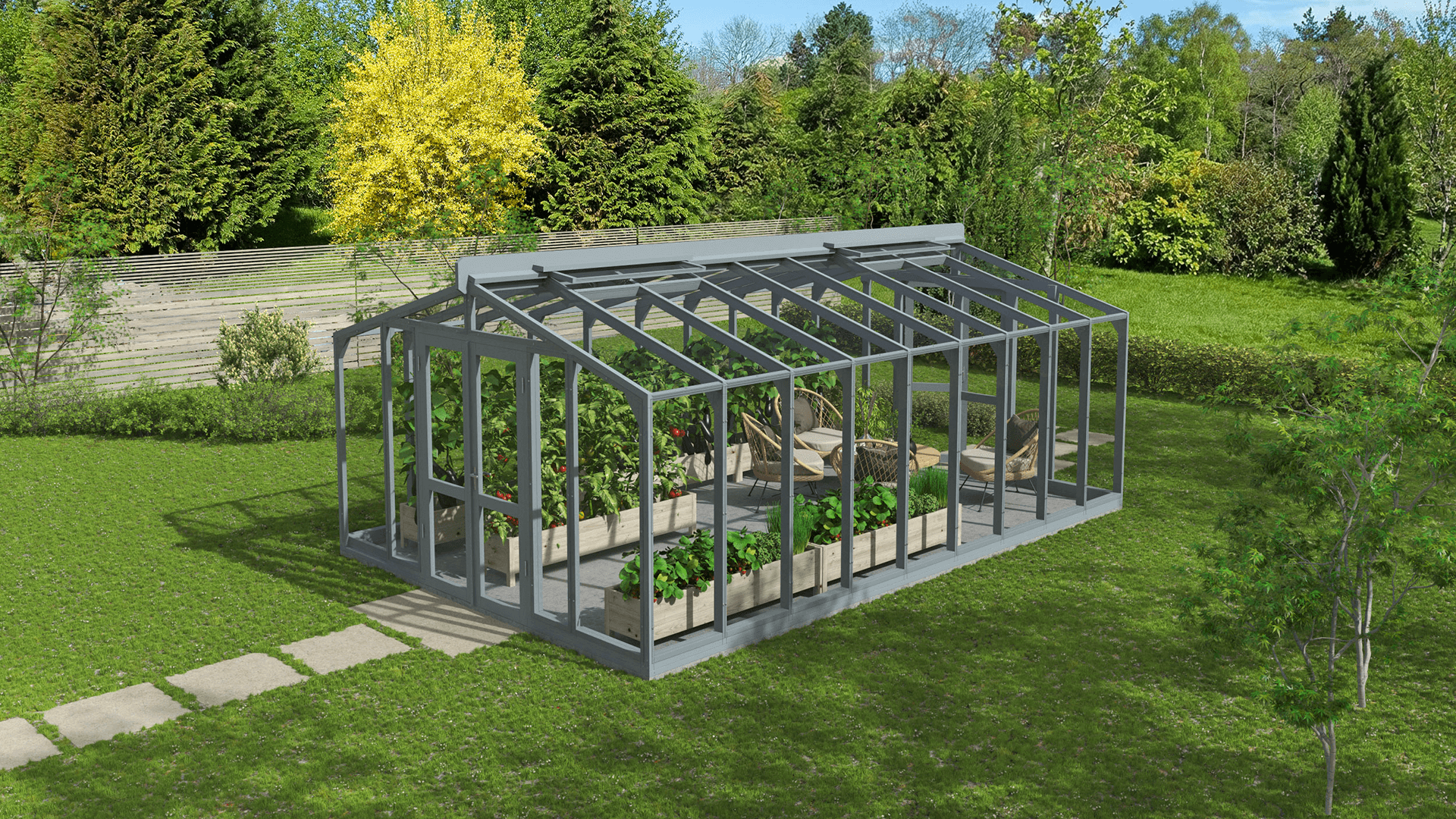 Šī koka siltumnīca ir ideāls mūsdienīga dizaina un dabiskas elegances apvienojums, kas lieliski papildinās jebkuru ārtelpu. Ar savu unikālo stikla uz rāmja konstrukciju tā iemieso perfektu stila, funkcionalitātes un mūsdienu inženierijas saskaņu. Izmantojiet to svaigu, bioloģisku dārzeņu, aromātisku garšaugu un krāšņu ziedu audzēšanai vai pārvērtiet to par mājīgu atpūtas vietu, kur atjaunot saikni ar dabu un baudīt ārtelpu komfortu neatkarīgi no laikapstākļiem.