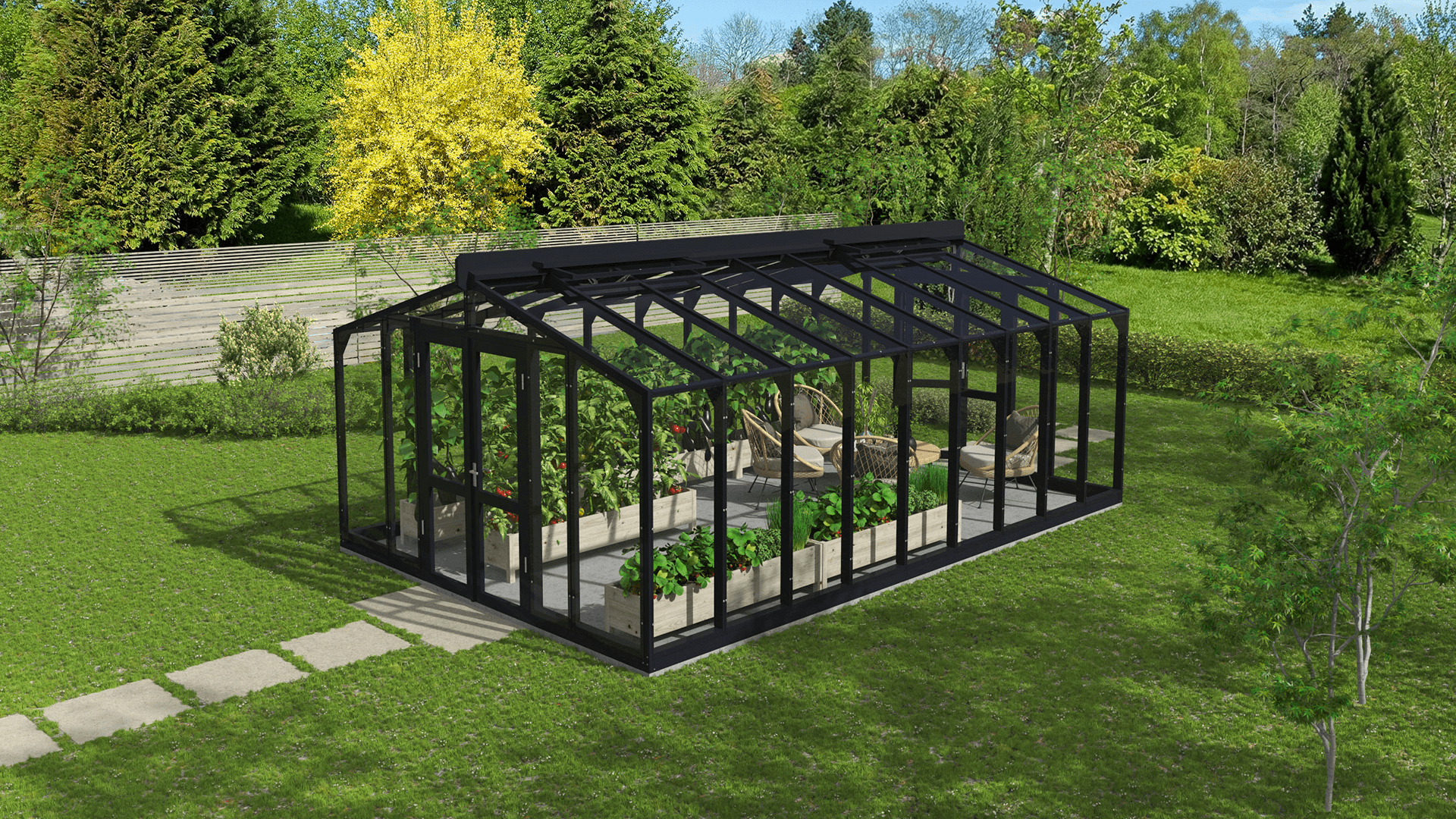Siltumnīca XL 9 ir pilnībā iestiklota ar izturīgu 4 mm rūdīto drošības stiklu.
