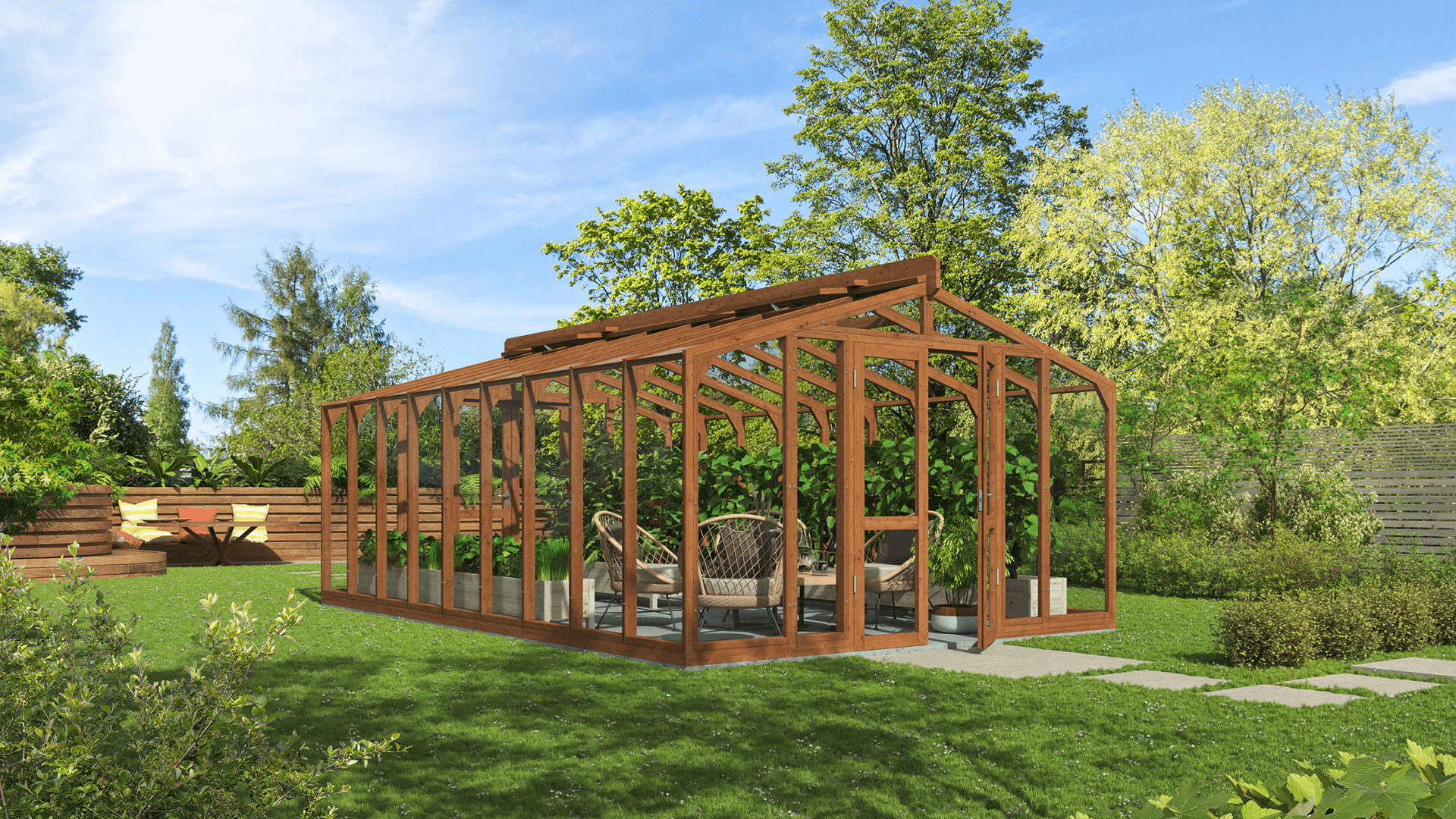 Koka siltumnīca nav paredzēta tikai augu audzēšanai — tā ir skaists dārza paviljons, kur varat atpūsties, ieturēt maltītes vai uzņemt viesus zaļuma ieskauti. Koksnes dabīgais siltums rada mājīgu un aicinošu atmosfēru, pārvēršot siltumnīcu par elegantu ārtelpu. Izmantojiet to kā mierpilnu atpūtas vietu, vasaras ēdamzonu vai radošu darba telpu — tā pielāgojas katrai sezonai un situācijai. Apvienojot funkcionalitāti un šarmu, tā ir vieta, kur satiekas daba un komforts.